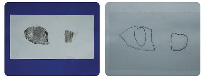 高度透明的PET塑料片。將兩張透明塑料片分別放置在現場足跡和樣本足跡上,用記號筆分別標畫足跡的特征點,再對兩張塑料片進行重疊檢驗。